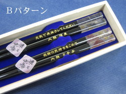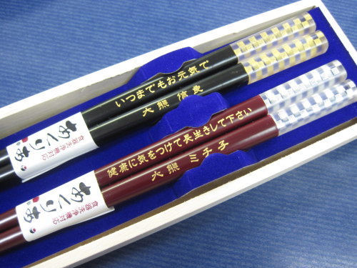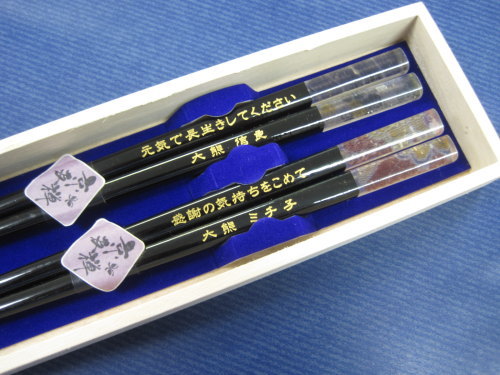 象嵌の、象は「かたどる」、嵌は「はめる」と言う意味があり、一つの素材に異質の素材を 嵌め込む技術です。 このお箸は、貝殻を嵌め込んでいます。 ![]() ※縦書き・横書きどちらでも加工可能です。 ※1膳20文字まで加工可能です。20文字を超える場合は1文字あたり50円追加となります。 箸は6種類から選べます ![]() 蝶 紅葉 兎 とんぼ 花びら 千鳥 ![]() 箸2膳・名入れ+メッセージ加工・色入れ(金)・桐箱・ラッピング 送料・代引手数料 込